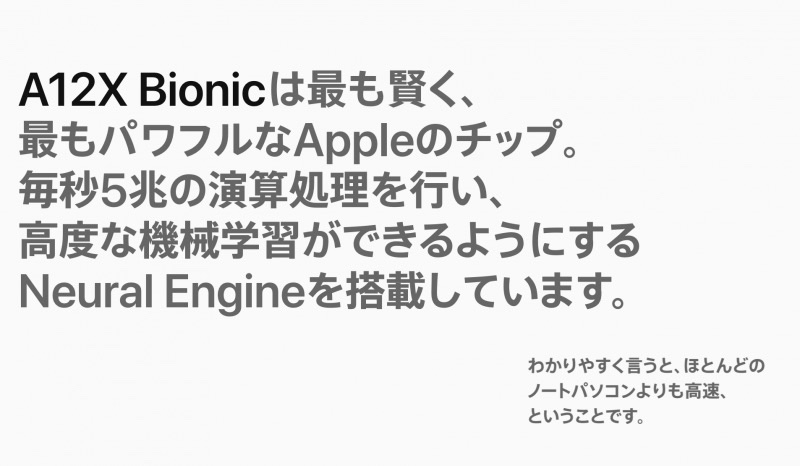 それだけではありませんA12X Bionic というチップが搭載されたことによりそこら辺のノートパソコンよりも早く動くんです!これについてはAppleもちっちゃく書いちゃってますね(笑)